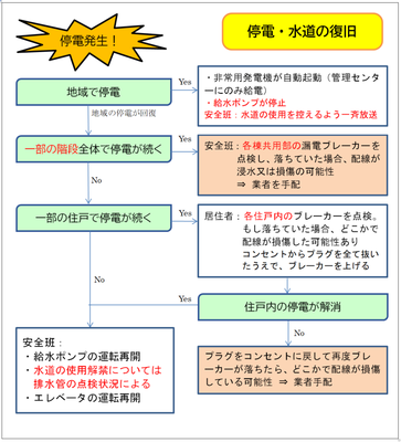 ①停電で給水ポンプが止まったら水道の使用を控えるよう一斉放送。 ②周辺地域の停電が復旧したら、給水ポンプの運転を再開。 ③階段全体が停電のままなら、各階段1階SK室のブレーカーを点検。 ④復旧しなければ修理業者を手配 ⑤エレベータは閉じ込め事故等がなければ運転を再開 |
