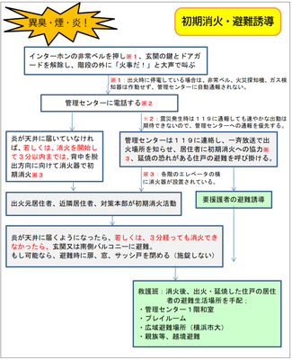 震度5強以上の地震が発生した時、まず最初に行う身の安全確保、出火防止措置、近接住戸の救援、津波や延焼の危険性の確認の4点を定めました。