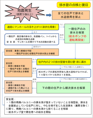 ①震度5強以上で一切の排水禁止を放送。 (液状化している場合) ②液状化している箇所のマンホールを点検し、流れていれば1階住戸での排水を解禁。滞留している場合は当該階の住戸で排水を禁止。修理業者を手配 ③地震発生後24時間経っても汚水漏れ通報がない階段では、水道の復旧次第、14階でバケツ洗浄試験を実施。 ④さらに24時間経っても汚水漏れ通報がない階段は水洗トイレ使用ほか排水を解禁 |
