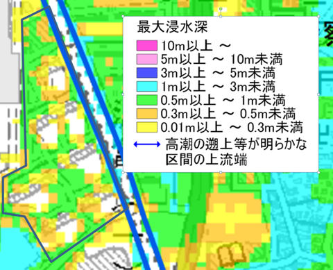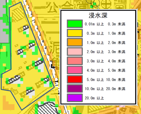 地震以外のリスクとしては、2021年に公表された内水ハザードマップ(下水道からの氾濫。出典7)では一部の棟で25~50cmの浸水が想定されています。
