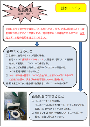 ※1:給水ポンプが止まったまま各住戸が水道を使い続けると、圧力低下で水道供給の再開に時間が掛かるため、停電が復旧して給水ポンプの運転が再開されるまでは、水道の使用を控える必要がある。